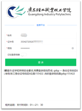 (B)一卡通网站方式缴费:在校园内连接无线热点GDIP_WEB,认证登录。账号是学号,初始密码是身份证后六位,若在智慧校园3.0修改过密码则和修改后密码一致。打开一卡通网站http://ecard.gdqy.edu.cn(未缴费用户也访问),登录账号是学号,密码是身份证后六位,用户类型选择学号登陆。根据所选择的套餐费用先进行校园一卡通系统充值缴费。先进行账户间转账,转账成功后点击网费缴费,确定后显示充值成功即可。