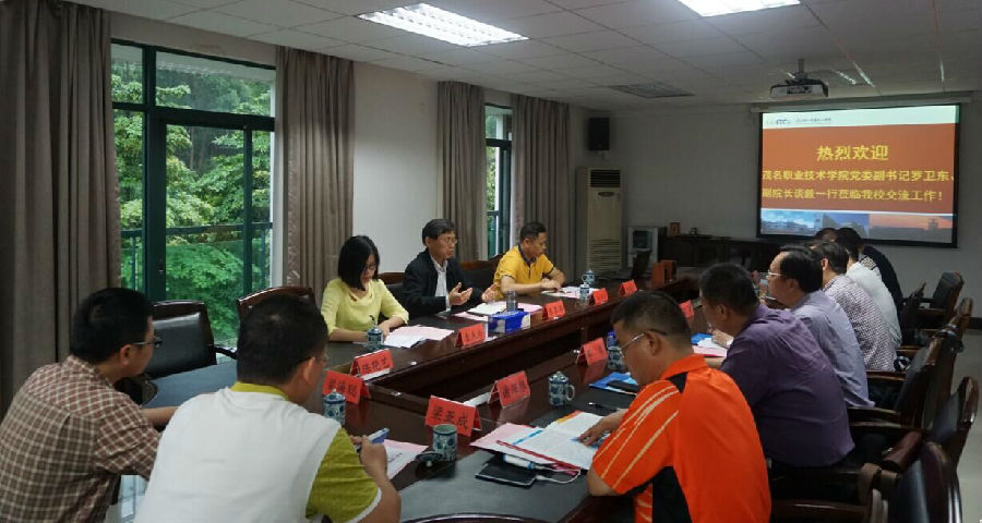 2016年4月20日下午,茂名职业技术学院党委副书记罗卫东、副院长谈毅一行9人来我校南海校区交流,学校党委副书记朱其祥参与了接待。本次交流的主题是办公自动化OA系统建设和使用经验以及学生食堂管理经验。学校网络信息中心及后勤产业处等相关部门人员参与了交流。